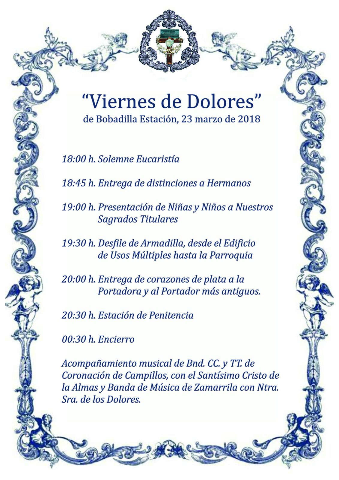 ITINERARIO: Plaza Virgen de los Dolores (Primer toque de campana al Cristo por D. Jose Luis Carmona, pintor del cartel del Viernes de Dolores 2018 y primer toque de campana a la Virgen por D. Andrés Artacho, pregonero del Viernes de Dolores del 2018), calle Nueva (petalada por nuestras mantillas a Nuestros Sagrados Titulares), Avda. Andalucía, Calle la Cruz, Calle P, Calle Colegio (22:30h, Acto Solemne frente a Edificio de Usos Múltiples), Calle J.M. Flores, Calle Colegio, Plaza de España, Calle Antequera, Plaza Virgen de los Dolores, 00:30h encierro.