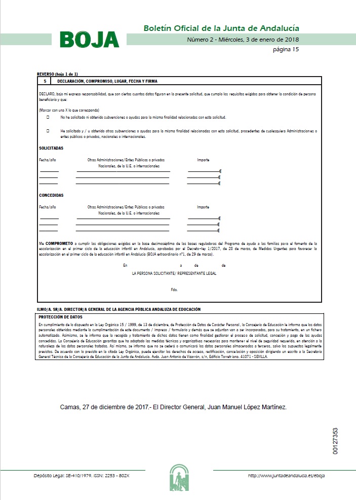 Desde la Entidad Local Autónoma de Bobadilla Estación, se informa a las familias de la Resolución publicada en el Boja, el pasado miércoles 3 de enero, de segunda convocatoria, en régimen de concurrencia competitiva, de ayudas a las familias para fomentar la escolarización de los niños y niñas menores de 3 años en los centros educativos de primer ciclo de educación infantil. La solicitud se formalizará utilizando el formulario adjunto y su plazo de presentación se iniciará el 15 de enero y finalizará el 31 de enero de 2018.