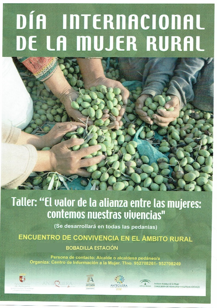 Con motivo del Día Internacional de la Mujer Rural, hoy martes 9 de Octubre, se ha realizado el Taller: «El valor de la alianza entre las mujeres: contemos nuestras vivencias», en Bobadilla Estación. Hasta aquí se han desplazado personal del Centro de Información a la Mujer de Antequera, para desarrollar esta actividad tanto en la ELA de Bobadilla Estación como en todas las Pedanías de Antequera. Diversas mujeres de la Asociación Germinar han acogido esta iniciativa con mucho interés participando en esta actividad con el fin de mejorar su calidad de vida a través de sus vivencias como mujeres en el entorno rural.