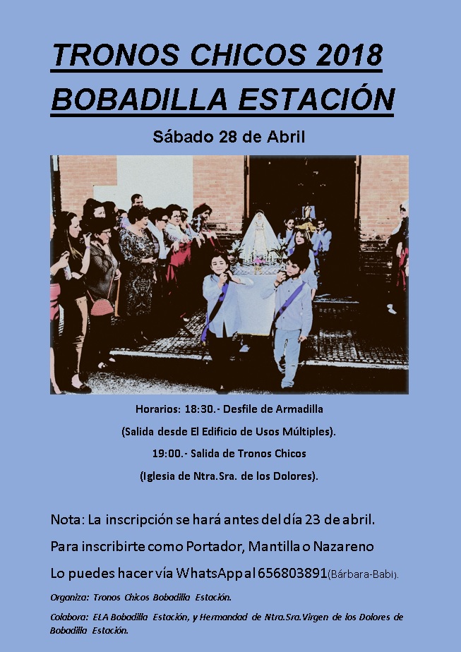 El sábado día 28 de abril se celebrará la tradicional Procesión de tronos Chicos en Bobadilla Estación. A las 18.30 saldrá el desfile de armadillas desde el edificio de usos múltiples. Una vez finalizada la procesión, todos los niños participantes serán obsequiados con una bolsa de chucherías.