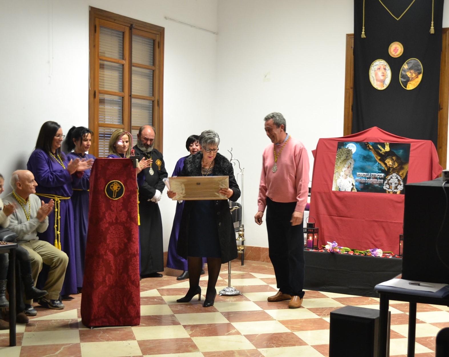 Ayer sábado día 30, se ha presentado en el Edificio de Usos Múltiples de Bobadilla Estación, el Cartel enunciador de la Estación de Penitencia del VIERNES DE DOLORES del próximo 18 de Marzo, de la Cofradía de María Santísima de los Dolores y el Santo Cristo de las Almas de Bobadilla Estación, la presentación ha estado a cargo de la Hermana de la Hermandad Conchi Romero, y el Hermano Mayor de la Hermandad D. Jose A. Gonzalez, que al término del acto de presentación del Cartel ha entregado a Conchi Romero, como detalle por su colaboración en Hermanad una enmarcación del cartel del VIERNES DE DOLORES 2016 presentado hoy, en la presentación se ha proyectado un video promocional del Viernes de Dolores 2016 elaborado por D. Francisco Gonzalez (Vice-Secretario de la Hermandad).