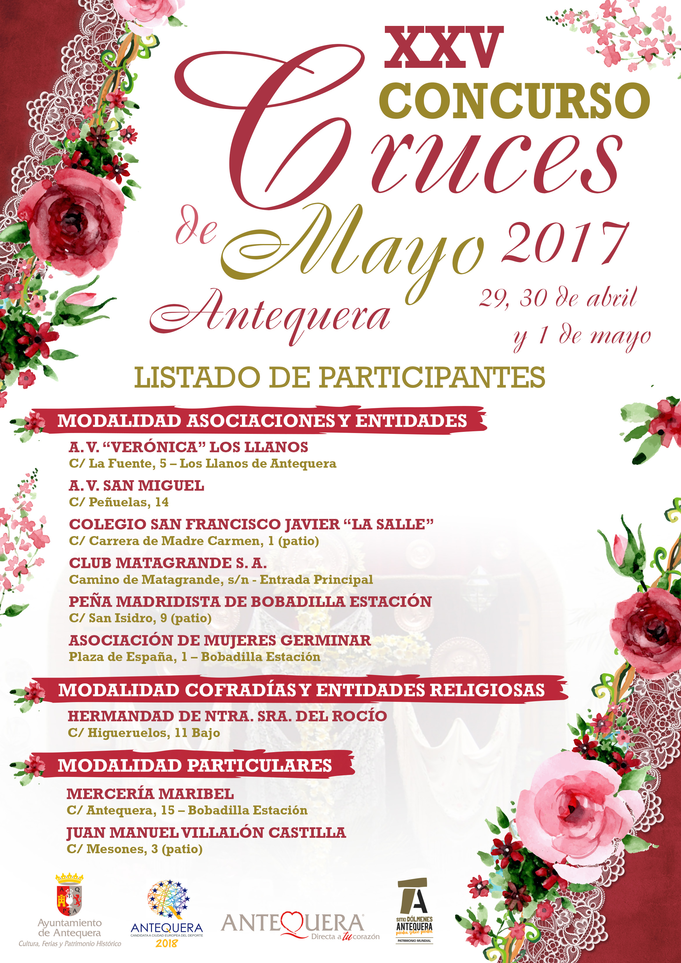 Como en años anteriores, Antequera celebrará las tradicionales Cruces de Mayo, durante los días 29, 30 de Abril y 1 de Mayo, en su XXV aniversario y dentro de las distintas modalidades, Bobadilla Estación, concursa en dos modalidades con tres participantes.