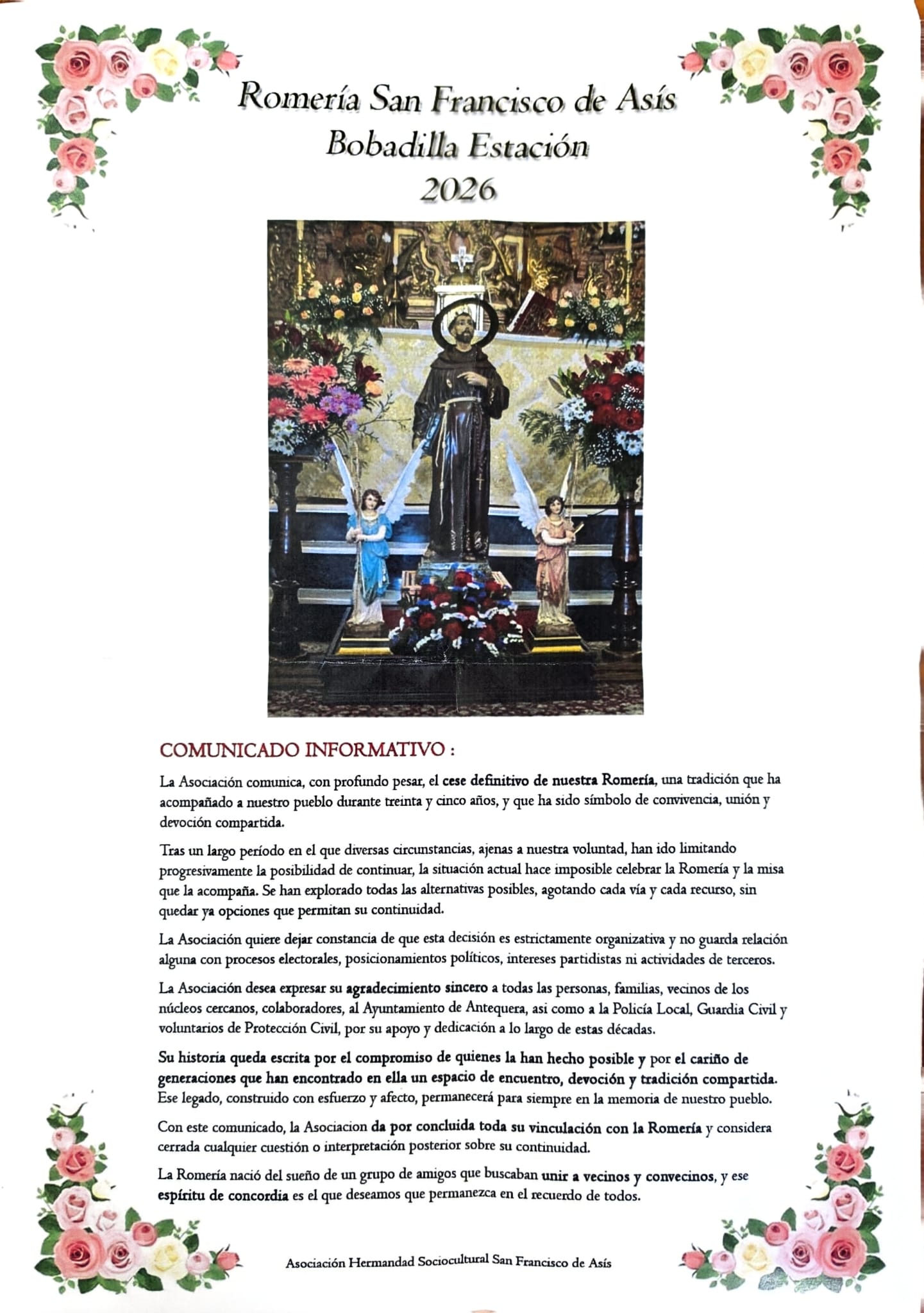 BOBADILLA ESTACIÓN | En una jornada marcada por la nostalgia, la Asociación Hermandad Sociocultural San Francisco de Asís ha hecho público un comunicado oficial en el que anuncia el cese definitivo de la Romería de Bobadilla Estación. Tras 35 años de historia, uno de los eventos más emblemáticos del calendario local llega a su fin, cerrando un ciclo de convivencia, unión y devoción.