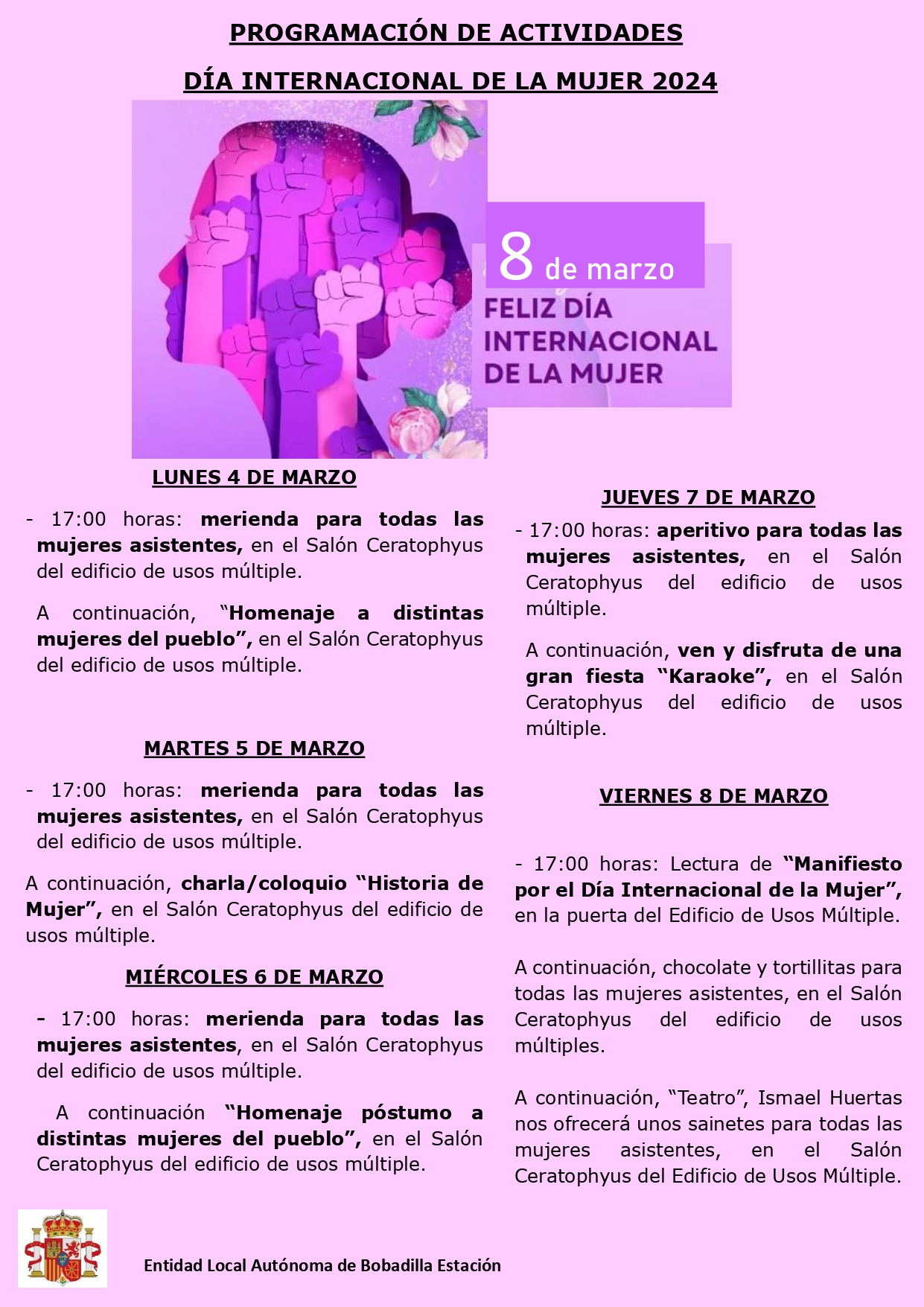 La programación del Día Internacional de la Mujer 2024 en la Entidad Local Autónoma de Bobadilla Estación se desarrolla del 4 al 8 de marzo. Esta incluye: